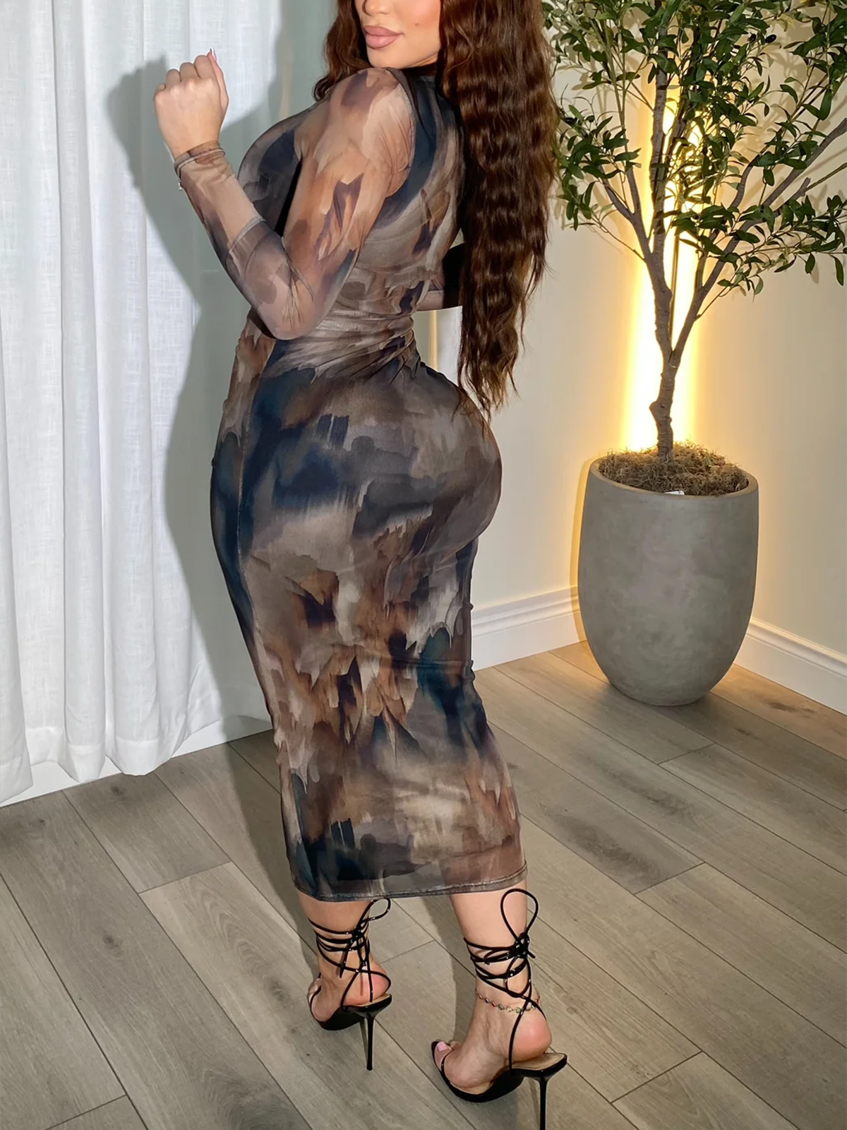 Wearable Art: Featuring an exclusive abstract watercolor print that blends floral motifs with artistic brushstrokes in earthy tones of brown. taupe. charcoal. and muted blue