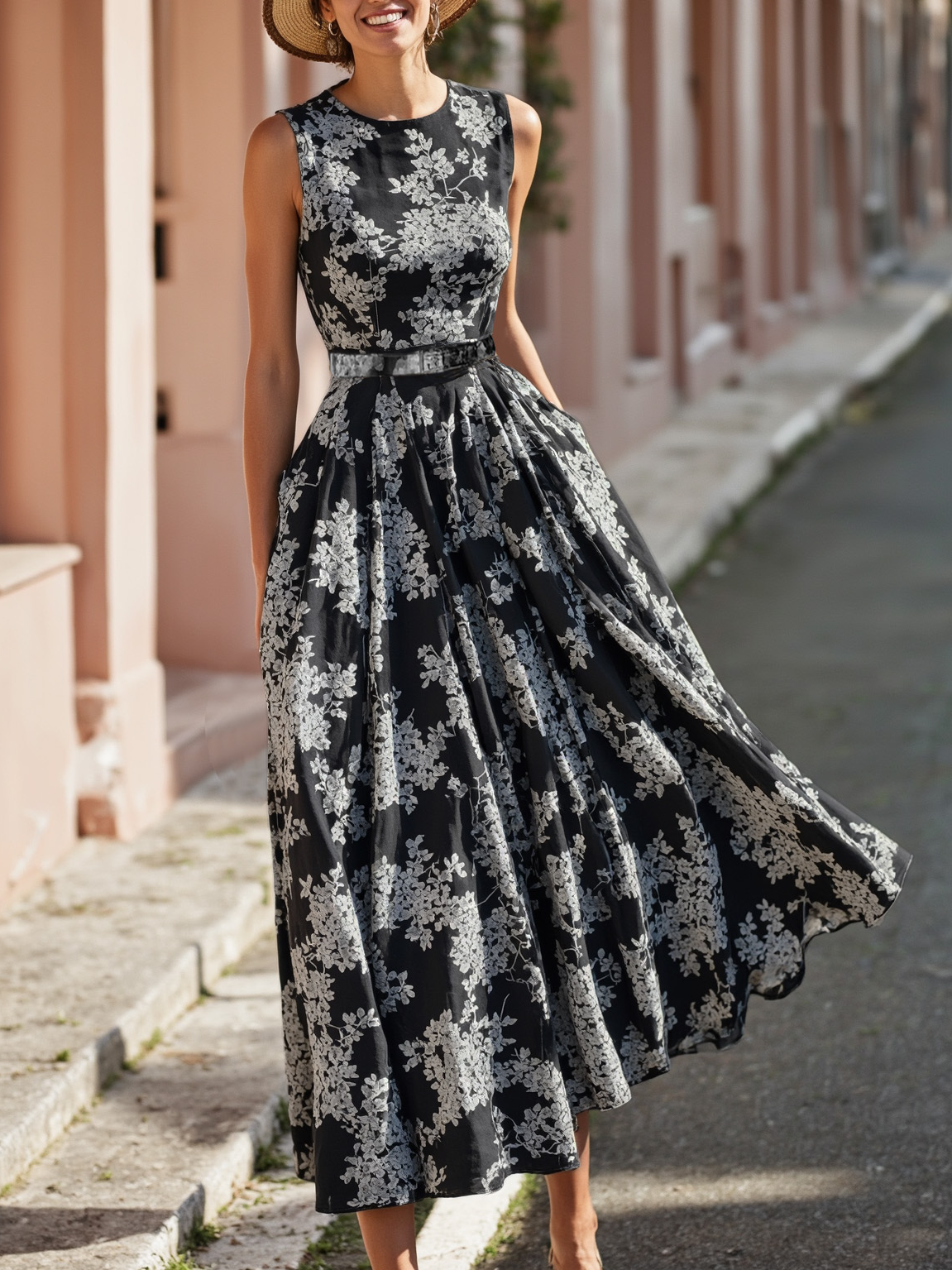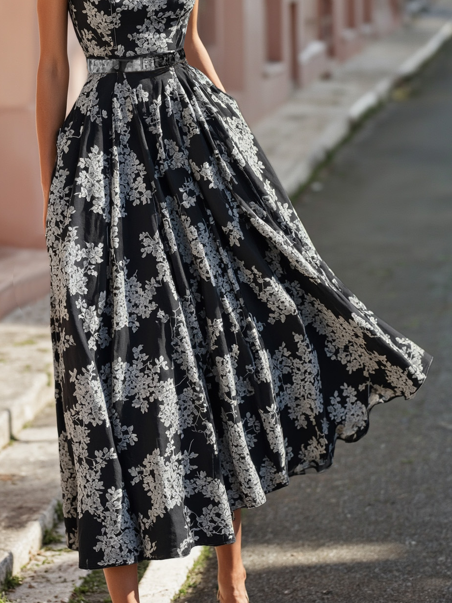 Be the first to review “Maxi Linen Dress , Sleeveless, Round Neck, Floral, Belt Design, Vacation, Vintage, Blue”