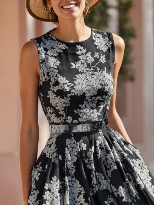 Maxi Linen Dress , Sleeveless, Round Neck, Floral, Belt Design, Vacation, Vintage, Blue